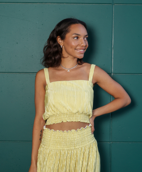 Pleated crop top with 1/2" straps and elastic waist. Comes in 5 colors: Sunshine (Yellow), Hibiscus Sunset (Hot Pink), Sea Green, Stormy Grey, Peach State of Mind (Soft Pink). Pair with Isla Charmed Skirt or your favorite shorts but the perfect Summer look.