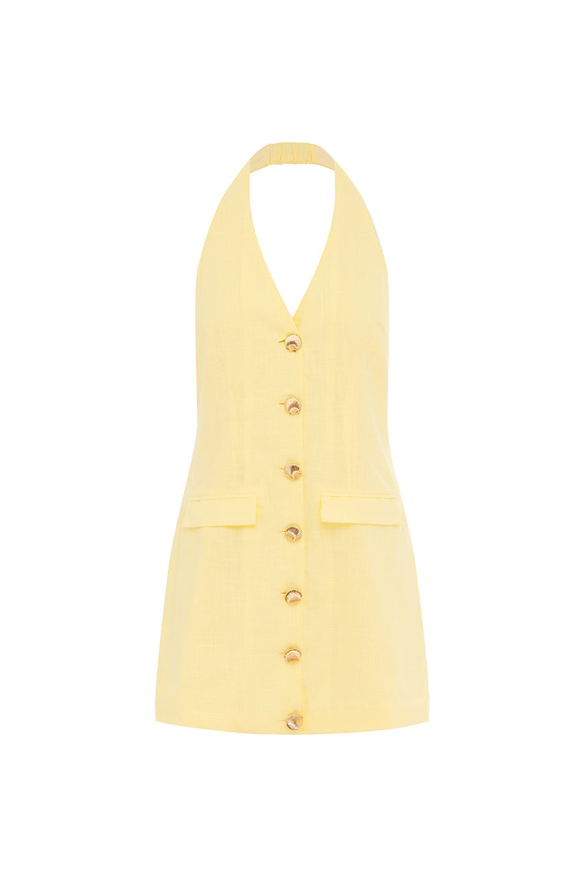 This Butter Yellow Mini Dress is the perfect balance of structure and edge, with a suiting inspired silhouette and low open back.