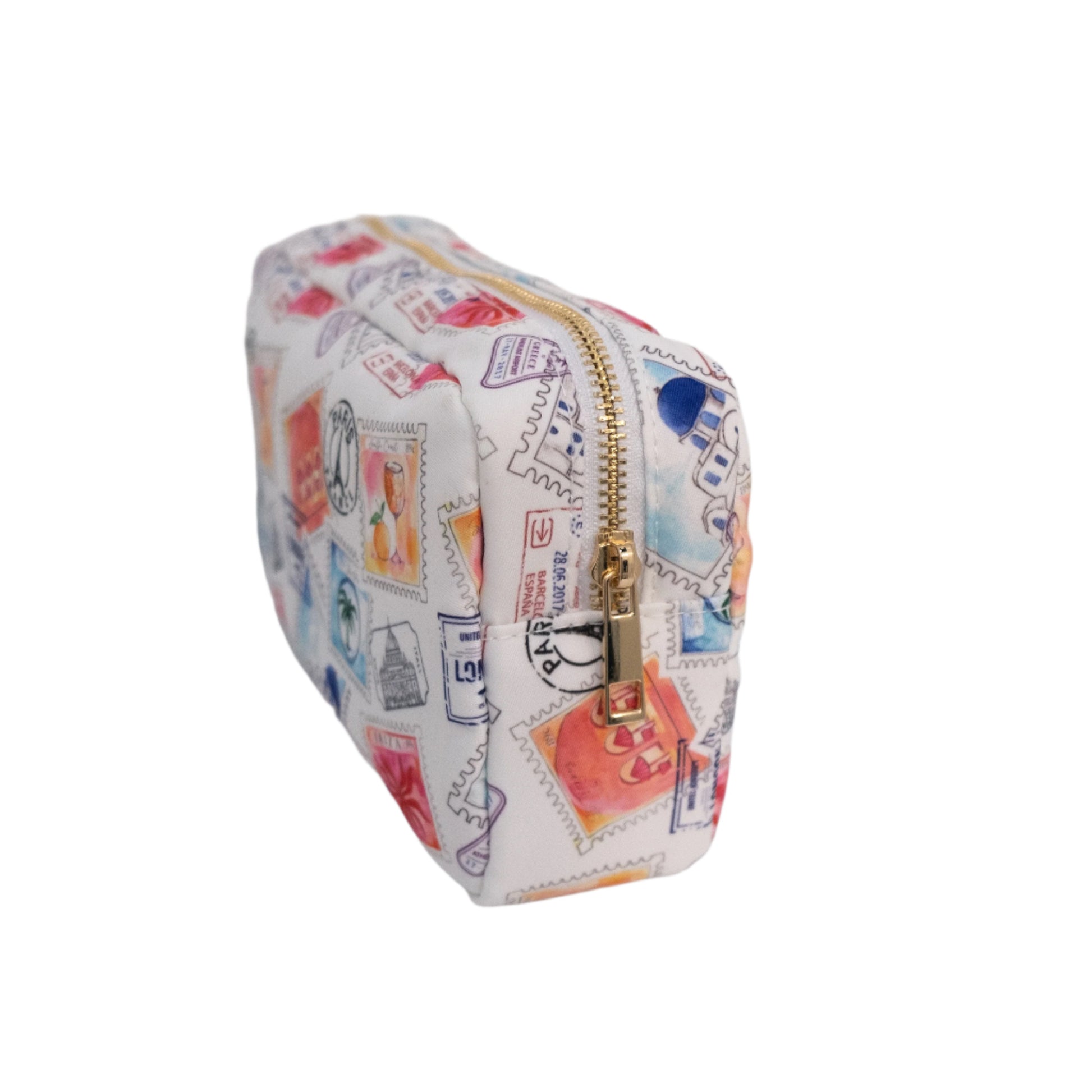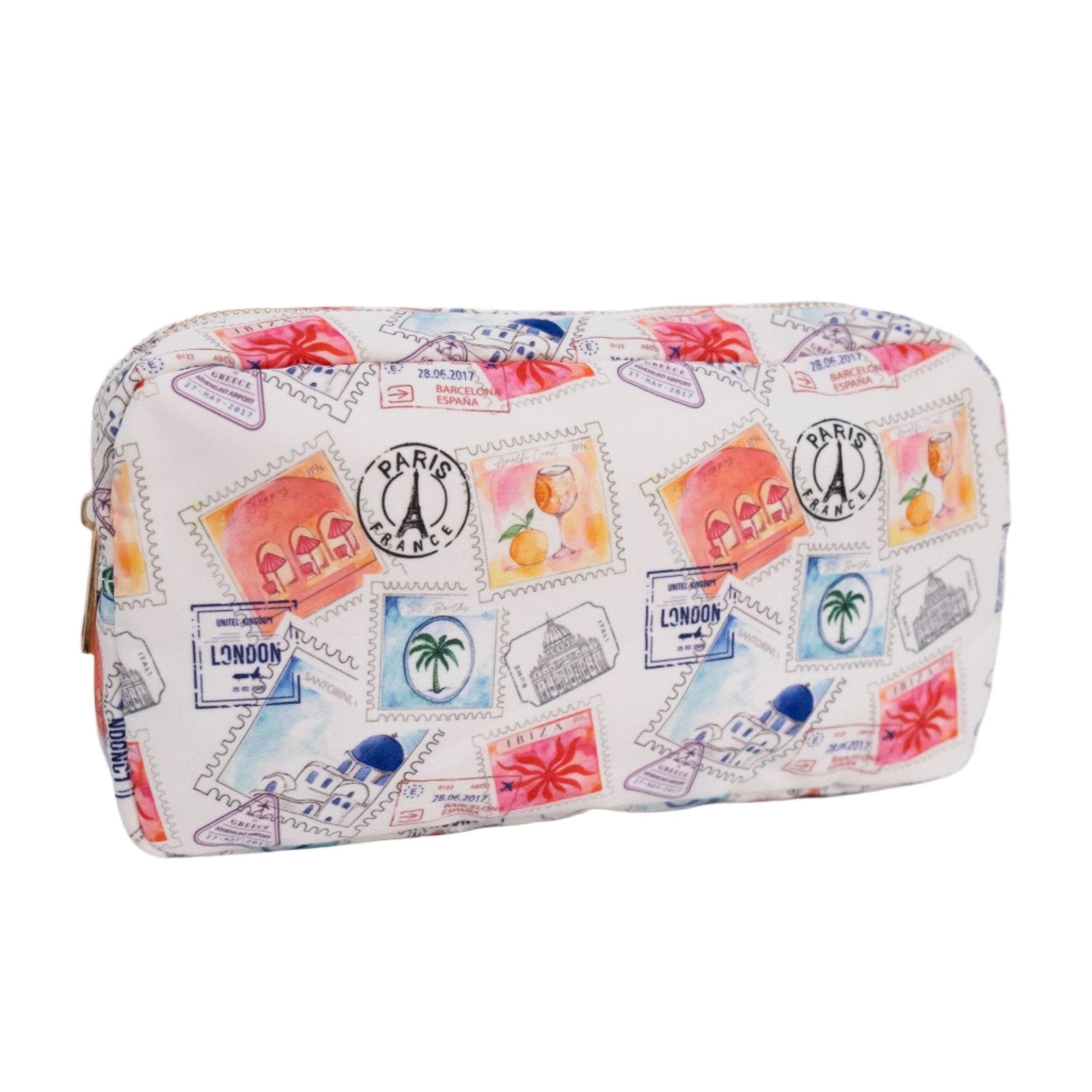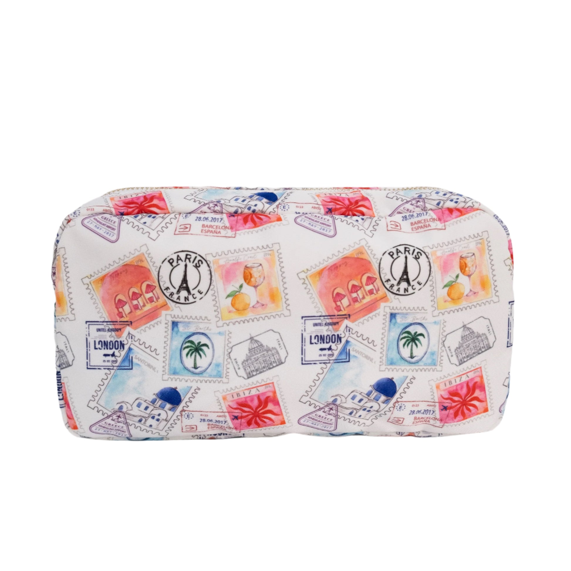 Keep your essentials organized in style with our Collecting Stamps Travel Print Nylon Pouch. Featuring a vibrant, watercolor travel-themed design with colorful stamps and iconic landmarks from around the world—Paris, London, Barcelona, and more—this pouch brings a touch of adventure to your everyday routine.