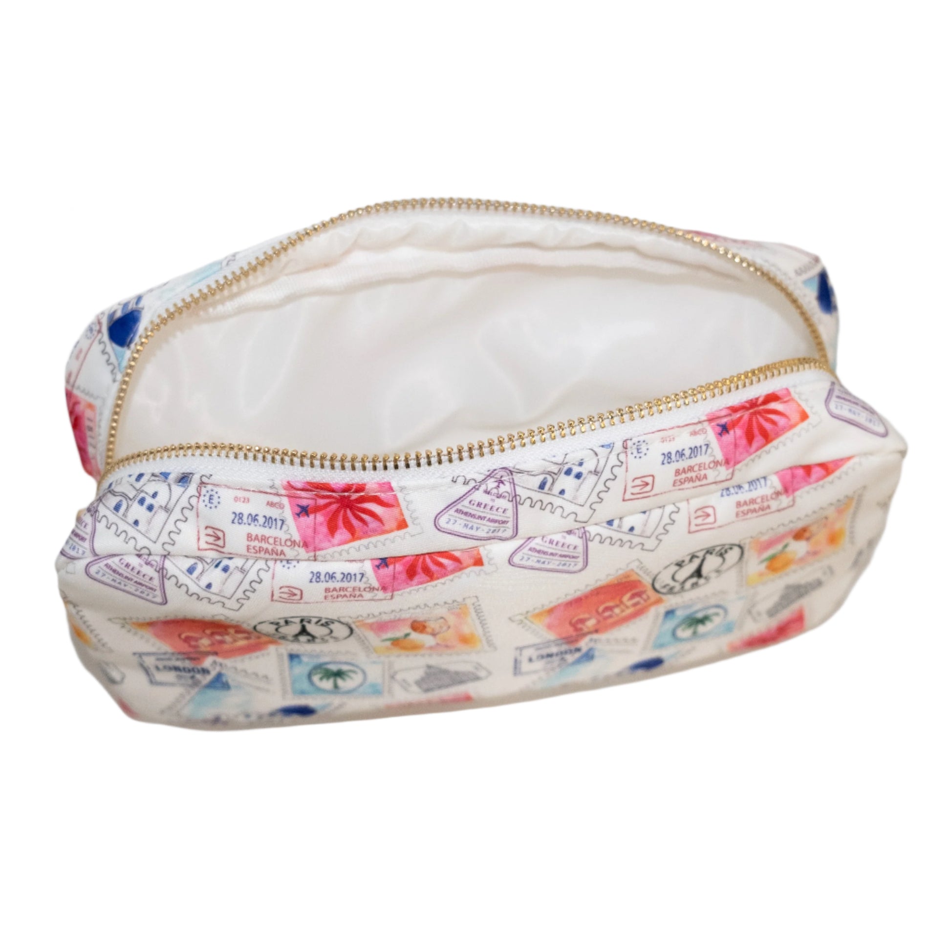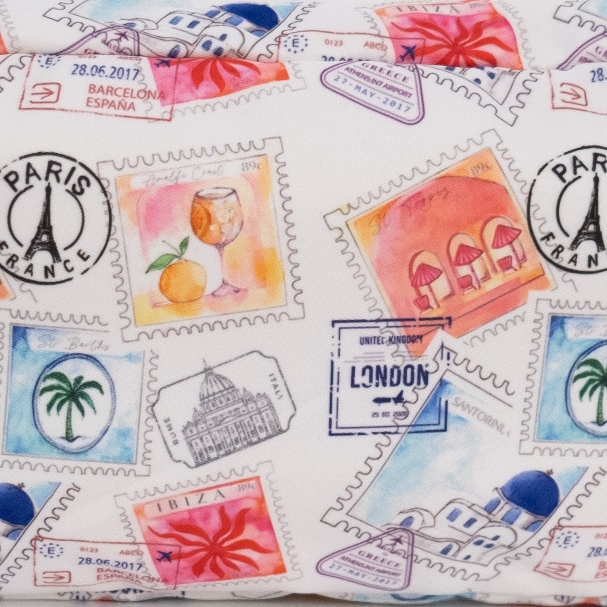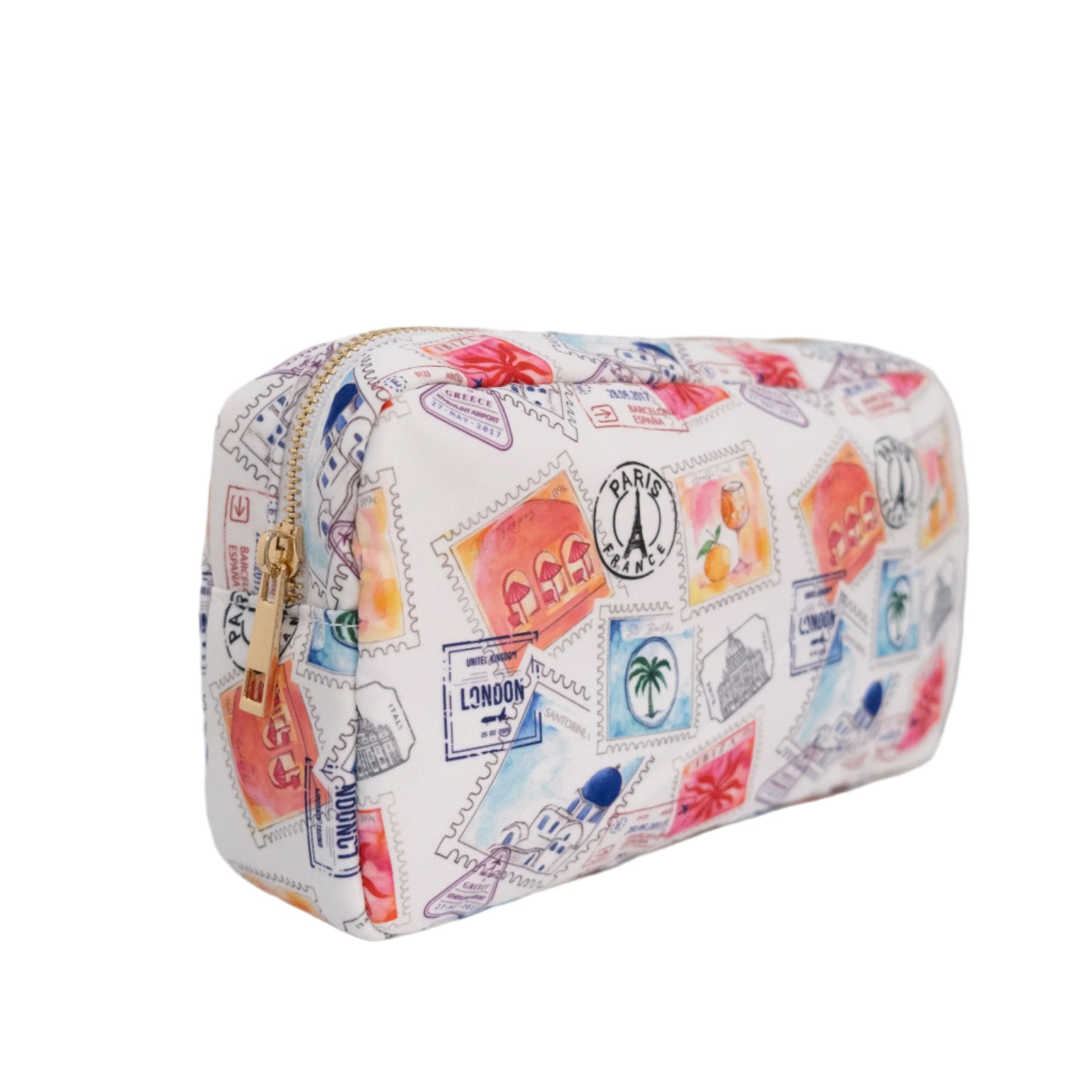 Keep your essentials organized in style with our Collecting Stamps Travel Print Nylon Pouch. Featuring a vibrant, watercolor travel-themed design with colorful stamps and iconic landmarks from around the world—Paris, London, Barcelona, and more—this pouch brings a touch of adventure to your everyday routine.