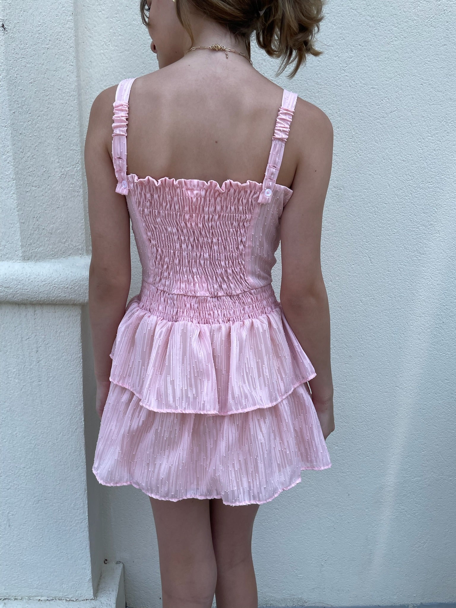 Our best selling dress in a shimmer tinsel fabric for that little bit of something. Dress has a two tiered skirt, smocked back and adjustable straps.