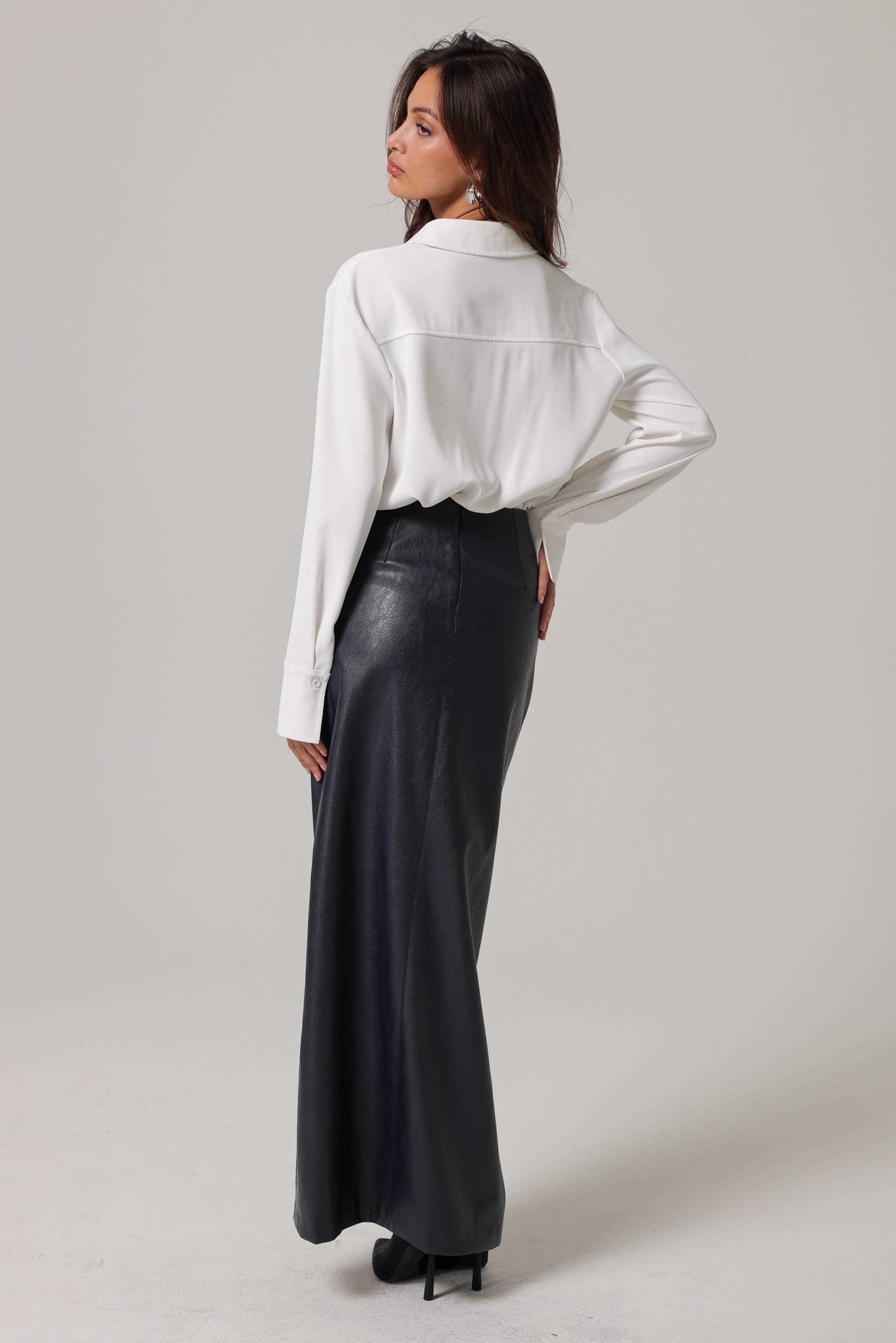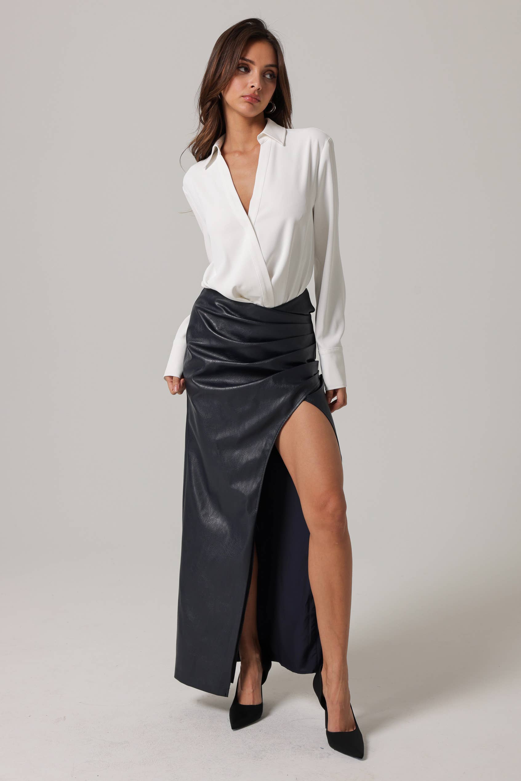 The HANSEN MAXI SKIRT brings understated elegance to your wardrobe with its luxurious midnight blue faux leather construction. Ruched detailing adds dimension and movement, while the dramatic high slit creates a refined silhouette that balances coverage with contemporary style. Perfect for evening events or elevated everyday wear, this piece transitions seamlessly from season to season.