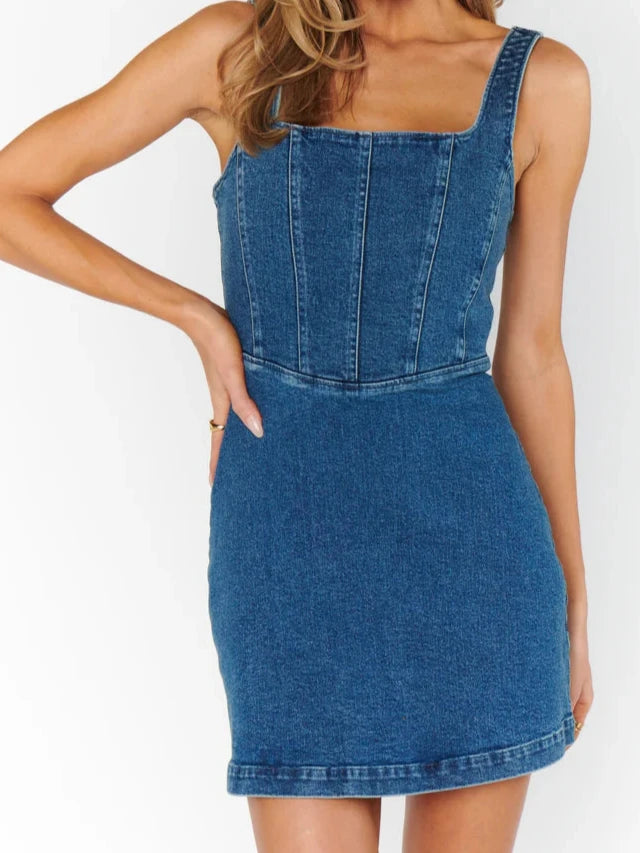 A fun take on a classic mini. Featuring a soft, stretch denim with a corset front and zipper back.