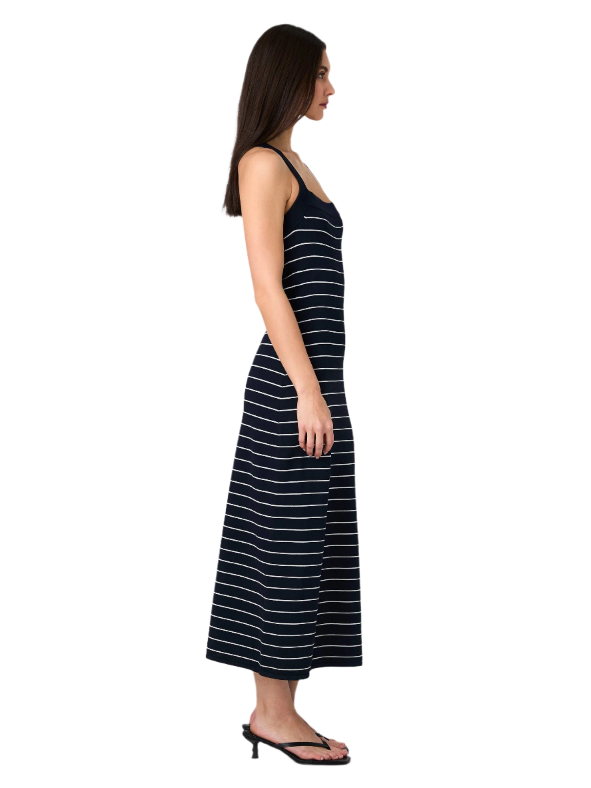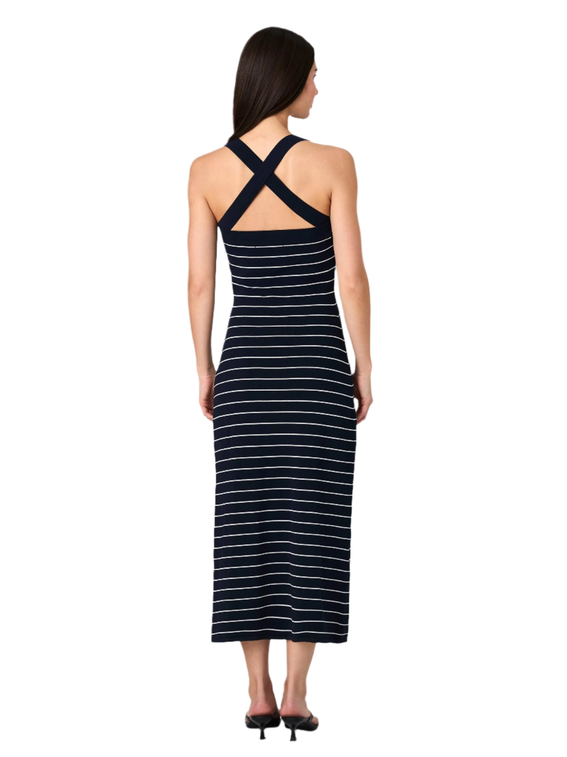 Let's get naughtical. Our Bodycon Cross Back Midi Dress features a curve-hugging knit with navy and white stripes, a square neckline, and crossover back straps for a little extra edge. A side slit on the left leg keeps things interesting, whether you're strolling the shore or hitting the city.