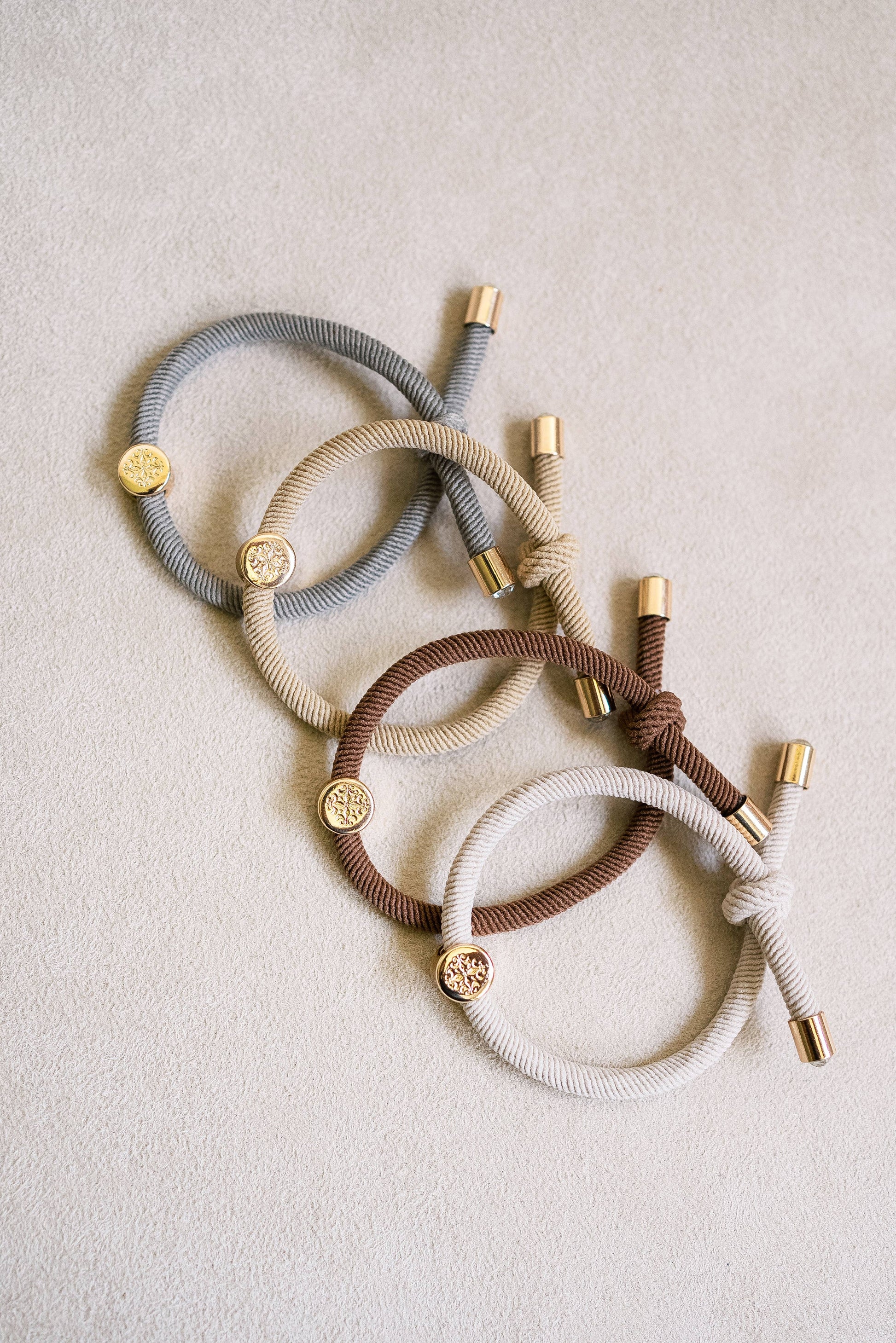 Hair Tie Set sold as a set of 4 - knotted hair tie that looks cute on your wrist and in your hair! Knotted detail and gold end caps with jewel center stone.