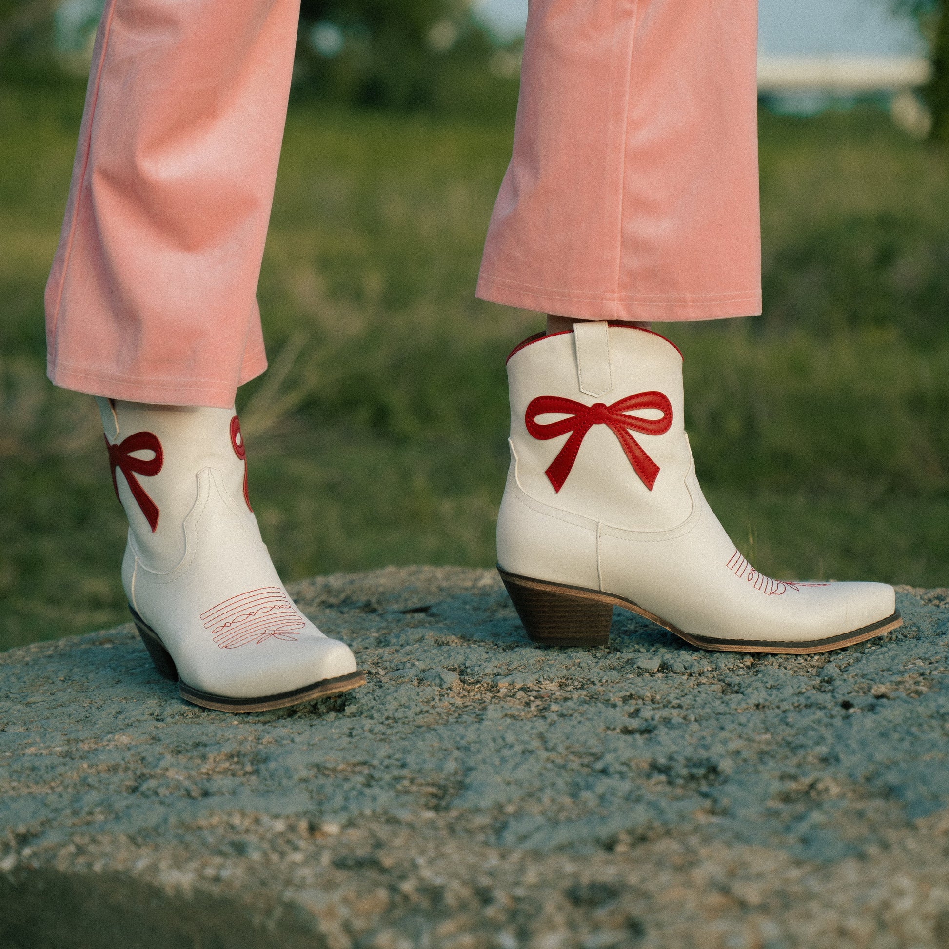 Yee-haw! Add some playful flair to your fall wardrobe with these cream cowboy booties featuring a fun red bow design. These cute booties are the perfect way to kick up your fashion game this season. Don't miss out on these must-have fall shoes! Get yours now!