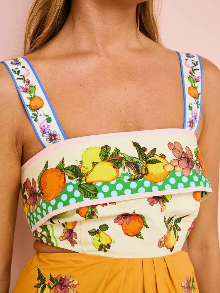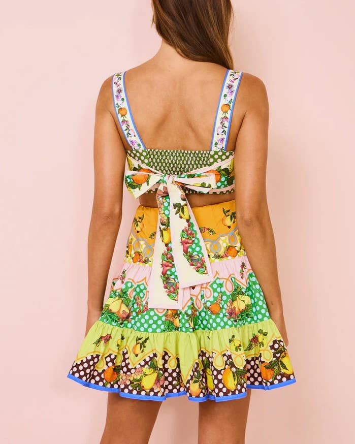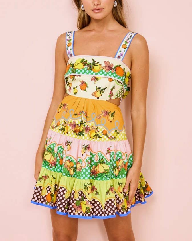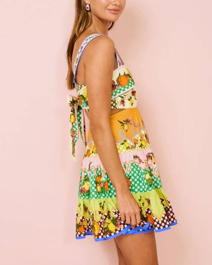 Brighten your wardrobe with this colorful fruit print mini dress, designed to bring a playful vibe to any occasion. The sleeveless, panelled silhouette offers a flattering fit, while the tie back adds a flirty, adjustable touch. Perfect for resort days or casual outings, this dress combines comfort and style effortlessly. Embrace the fun spirit of summer with this lively, eye-catching piece that’s sure to turn heads wherever you go.