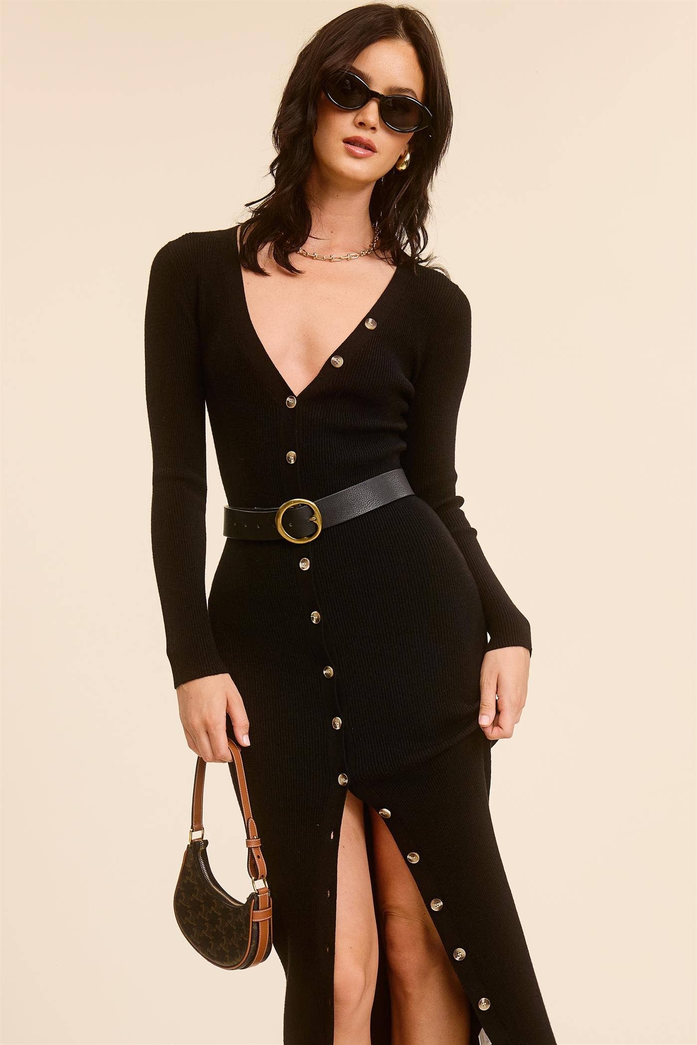 Made from a solid ribbed knit, this longline cardigan dress features a deep V neckline with asymmetric button detailing on one side, long sleeves, and a full button-down front with contrast buttons. The body-hugging silhouette and front slit add a sleek, modern edge. Style it buttoned up as a sleek midi dress or wear it open over denim for a casually layered look. It’s a versatile statement piece you’ll reach for all season long.