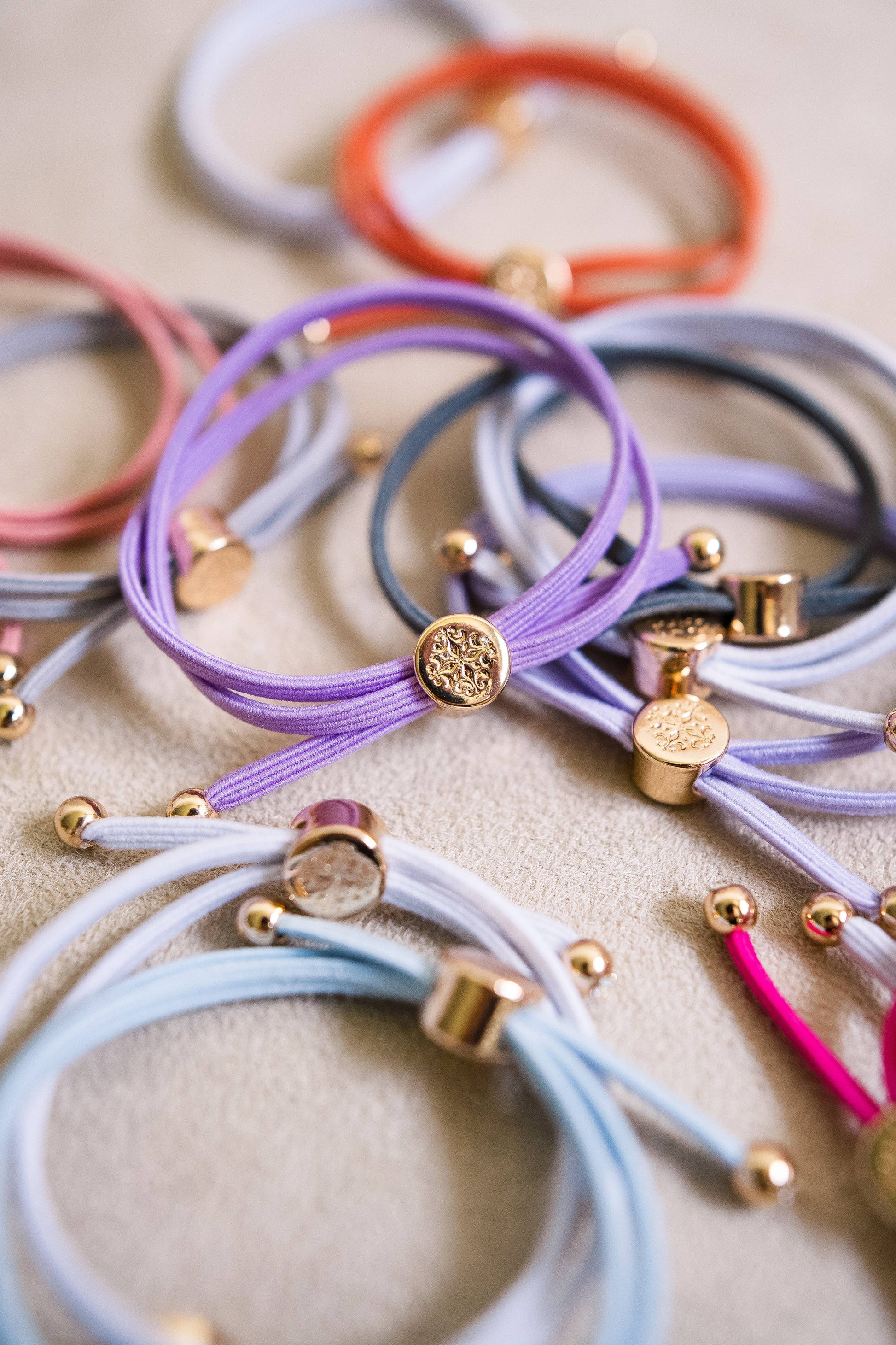 Skinny Hair Tie Set sold as a set of 4 - double wrapped thin hair tie that looks cute on your wrist and in your hair! Minimal sleek style hair tie with round gold end caps and signature gold detail on the end cap.