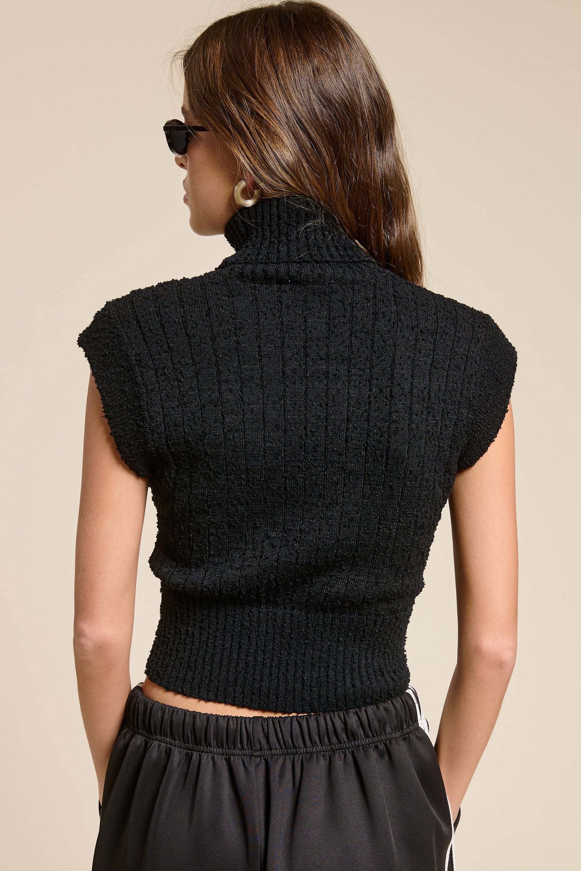This sleeveless knit turtleneck sweater is made from a soft ribbed popcorn stitch, giving it a cozy yet textured feel. Designed with a foldover turtleneck, capped sleeves, and a cropped wide to slim silhouette, it creates a flattering fit that layers seamlessly from fall into winter. Perfect for pairing with wide leg pants, jeans, or under blazers, this versatile knit top works as a chic office layer or styled casually with denim for everyday wear.