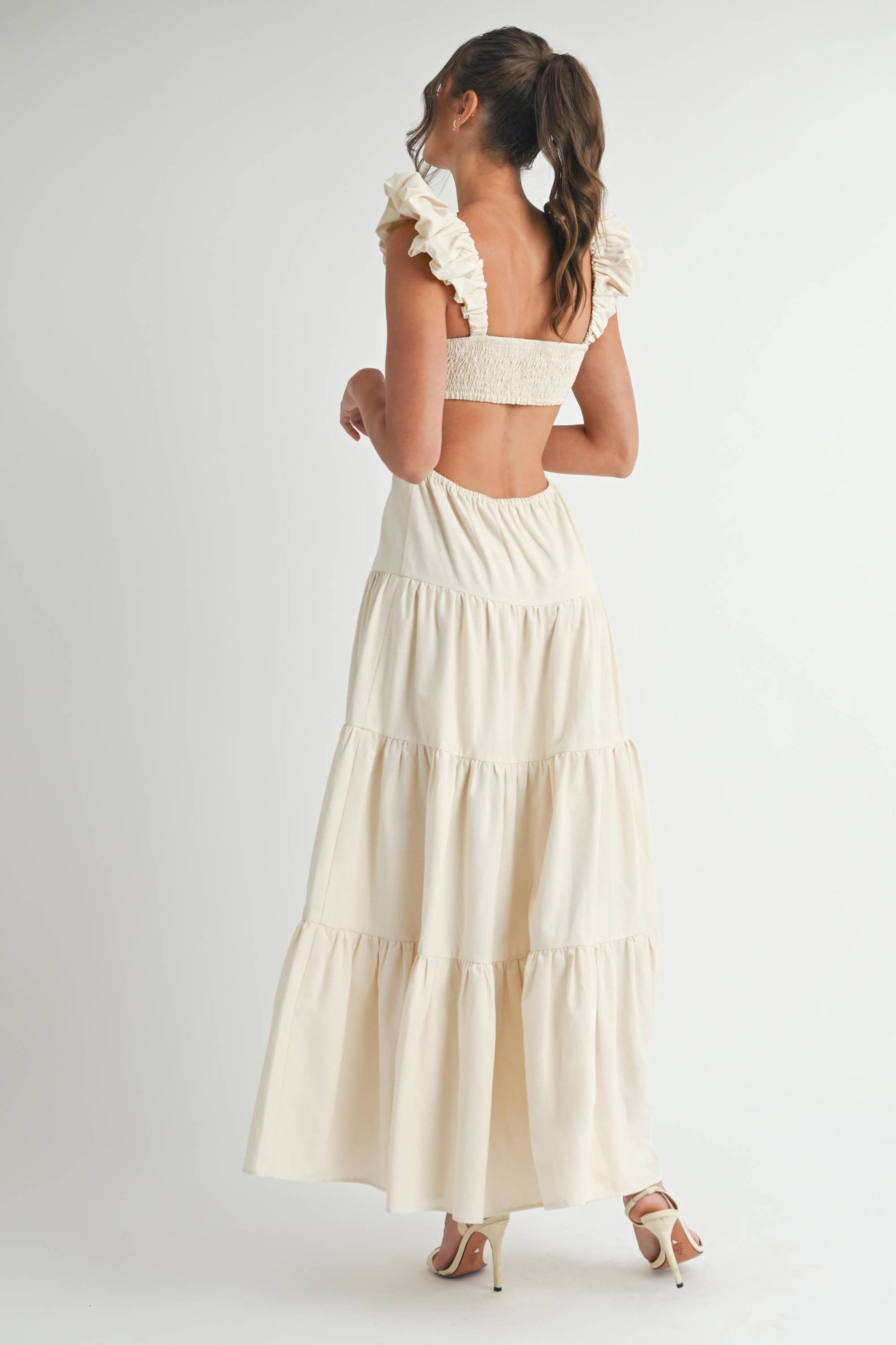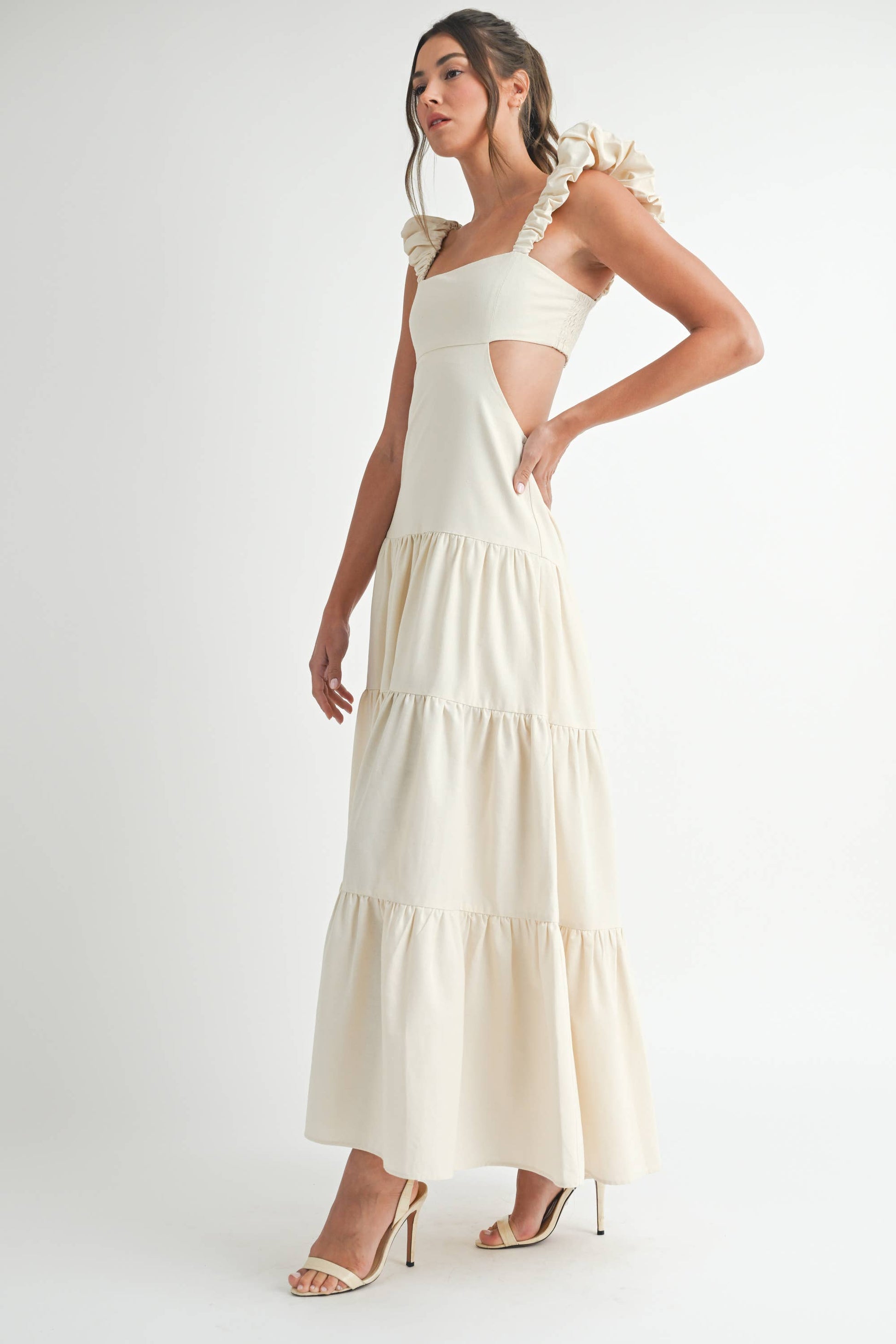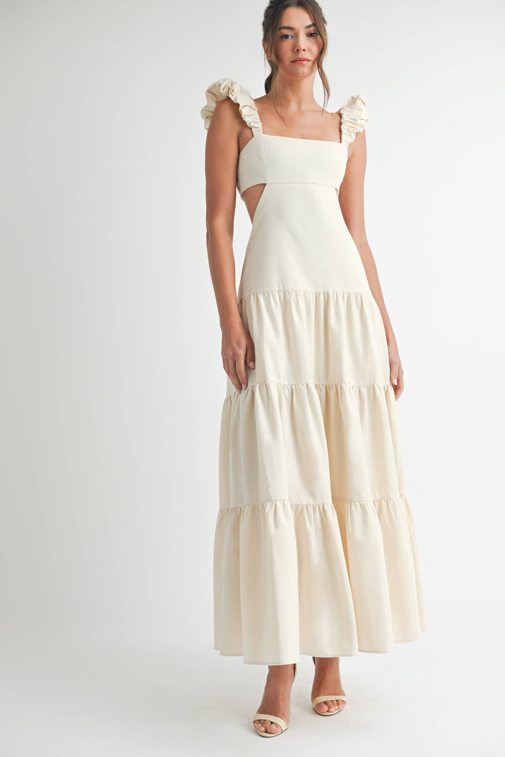 This midi dress features ruffle short sleeves and a tiered maxi design, creating a stylish and feminine look. The cutout back and elastic detailing ensure comfort and ease of movement. This versatile dress is perfect for any occasion