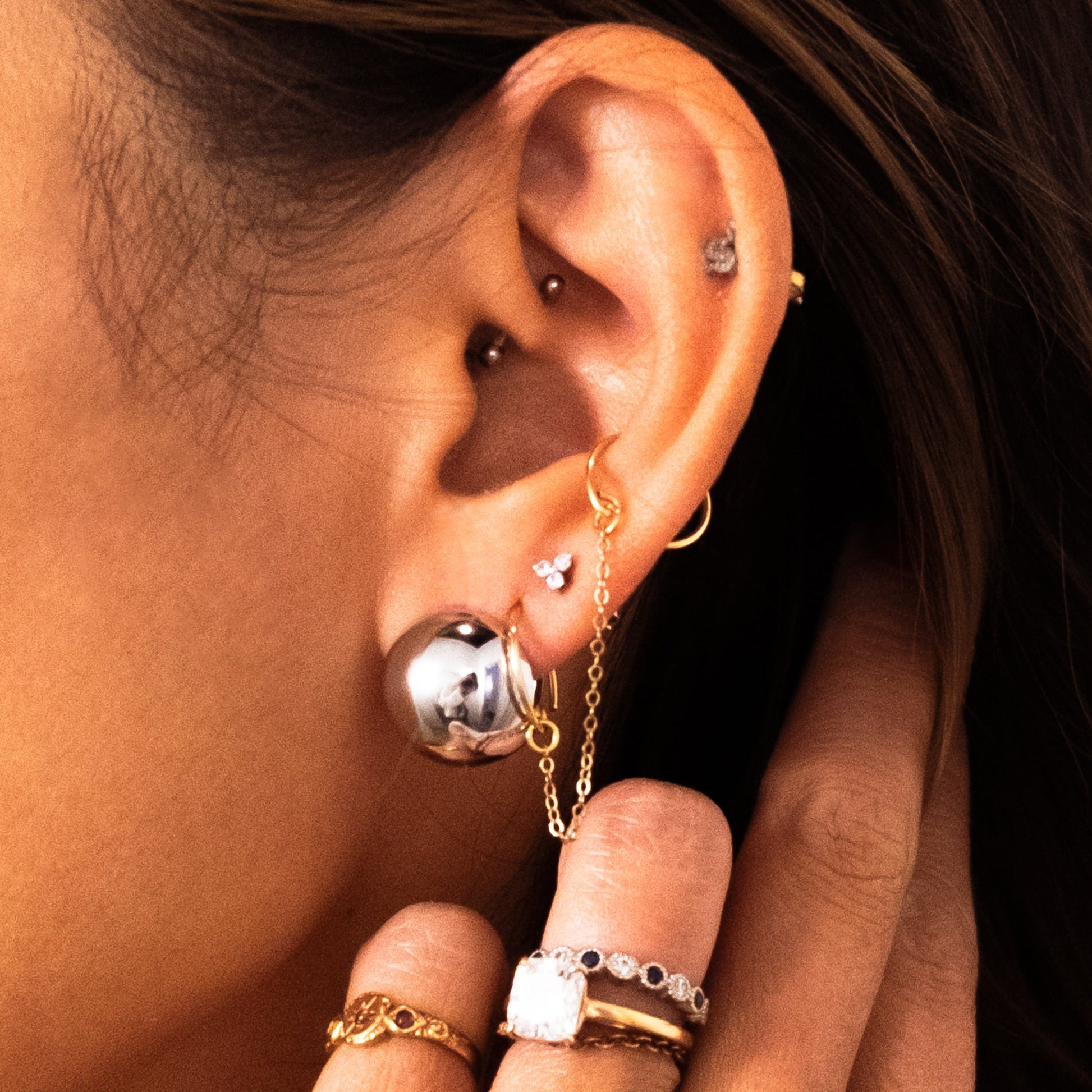 Sits flat and comfortable on the lobe. Has a Huggie fit to drop off the load just enough to complete to puffy look Steel with high polish with silver plating.