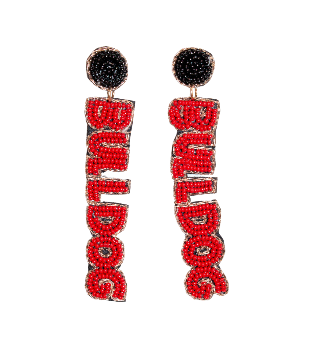Beaded black and red "BULLDOG" 3" drop studded earrings