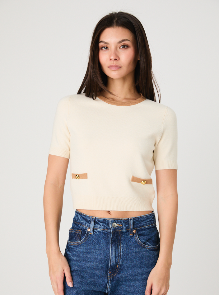 Lightweight porcelain cream short sleeve knit with camel hemmed faux pocket