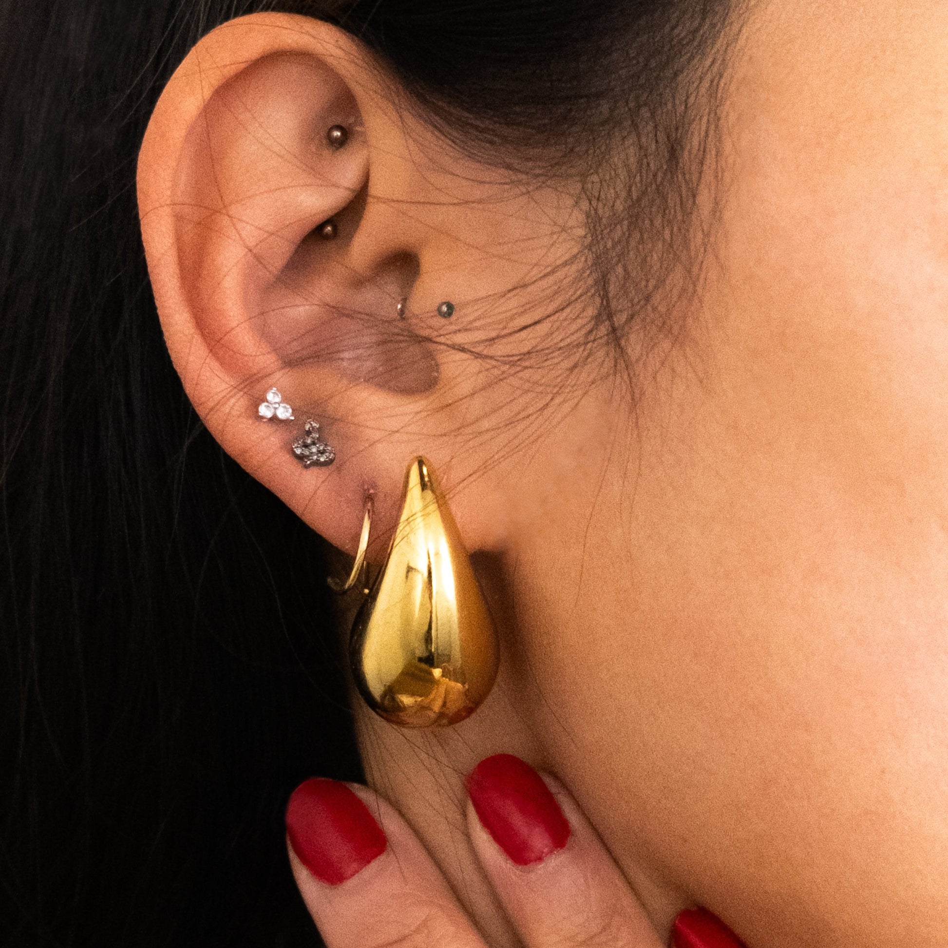 These earrings are made with ultra high shine PVD plated making them waterproof, hypoallergenic and very long lasting.