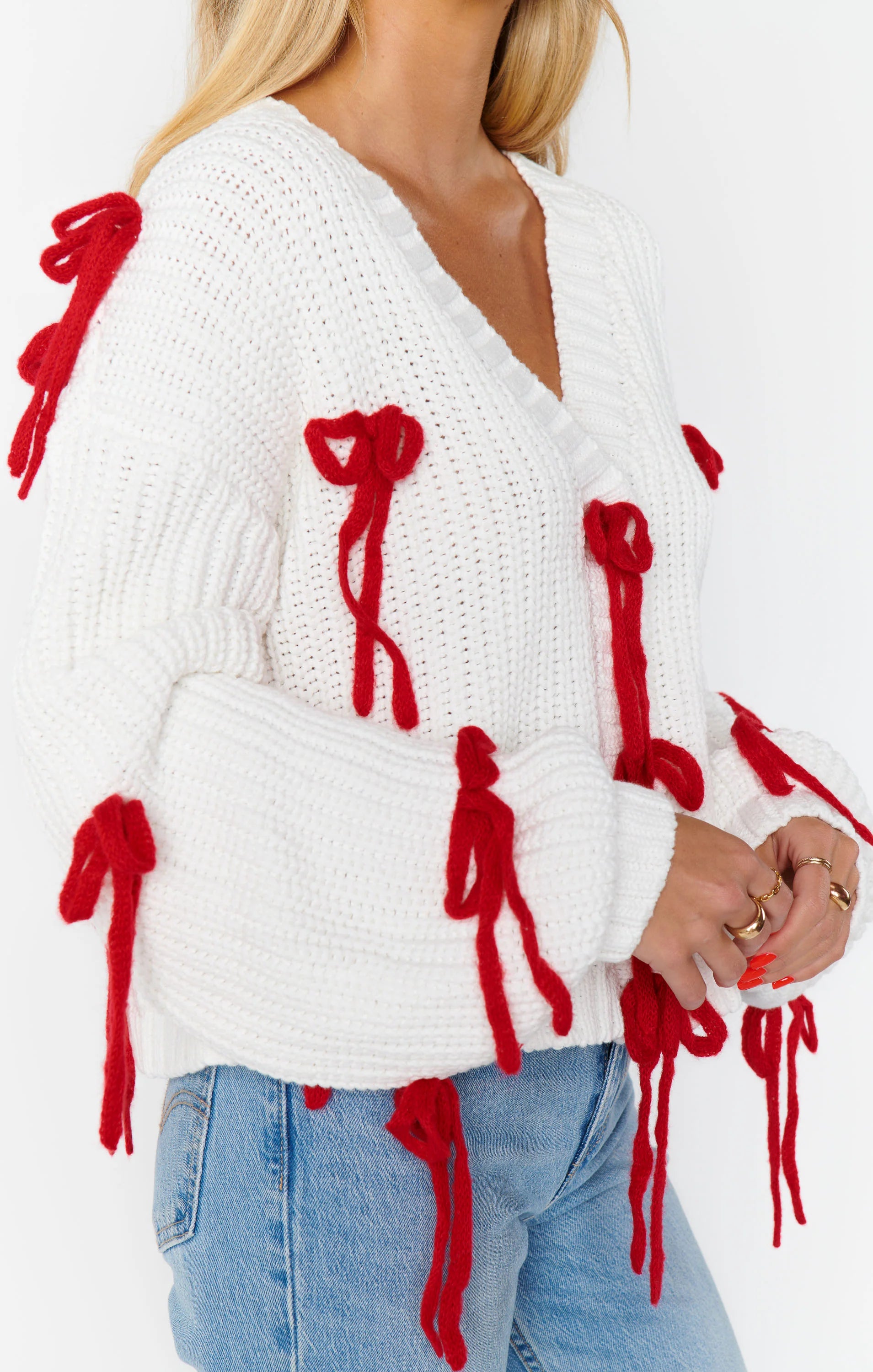 Add a little positivity to any outfit with the Good Karma Cardi! With large bubble sleeves, dropped shoulders, adorable red bow ties, and a classic v-neck cut this cardi pairs easily with all of your favorite tanks and tees. You won't be able to keep a smile off your face while wearing this adorable cropped cardi!