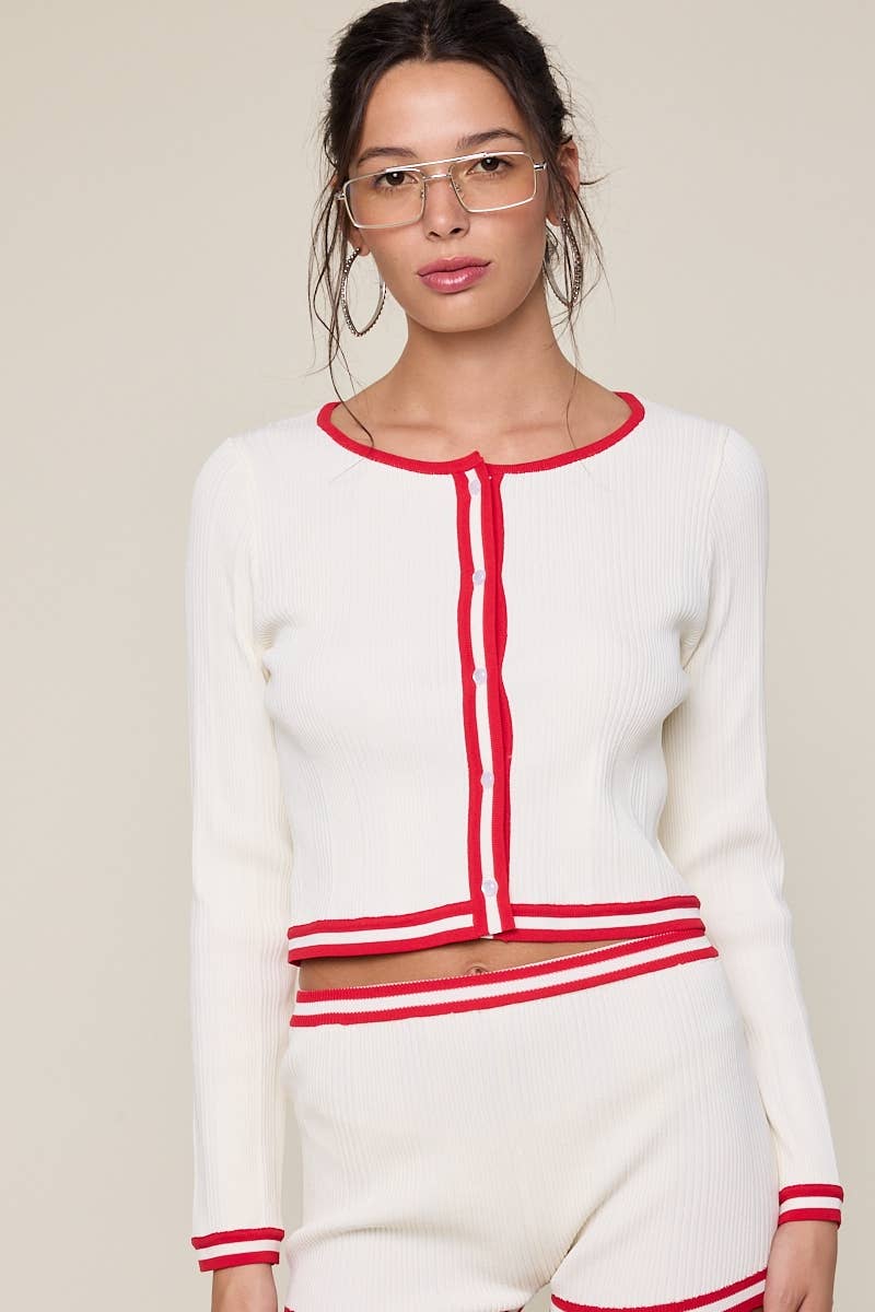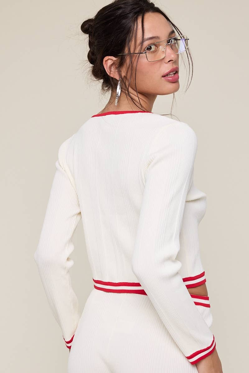 Solid Color Boat Neck Long Sleeve Front Button Down Color Line Point Crop Knit Top