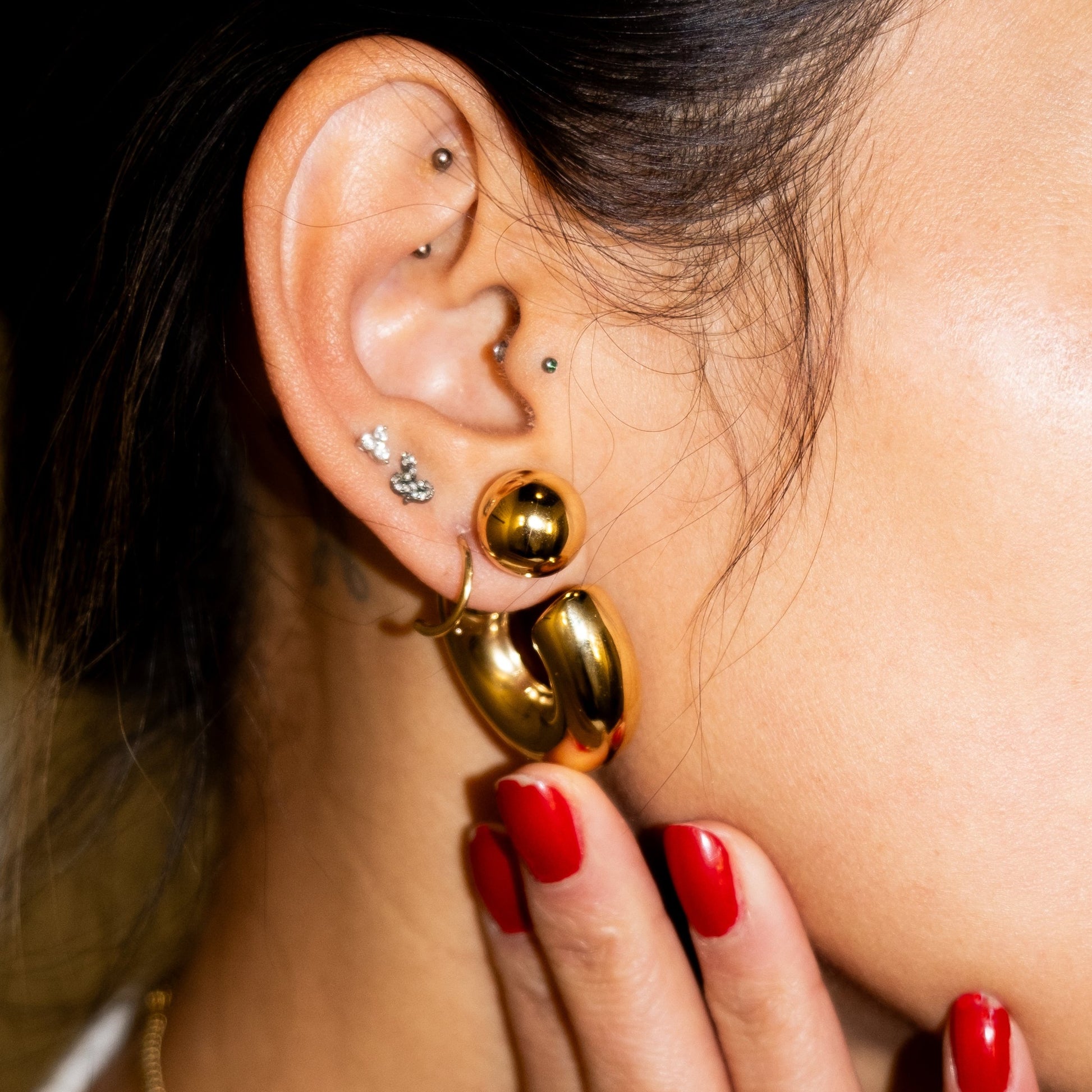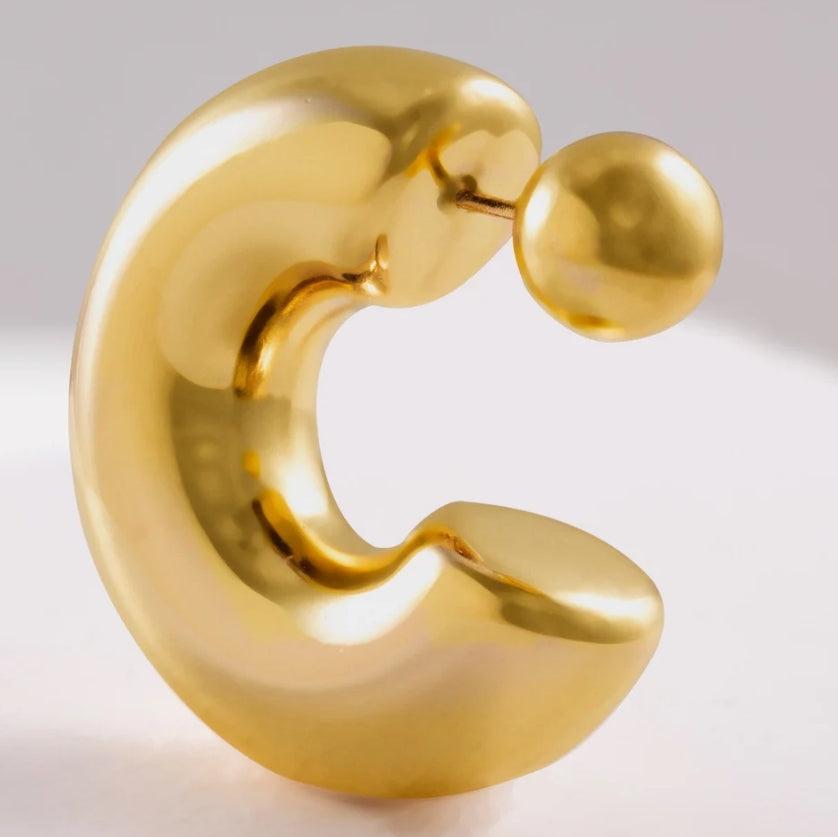 The Puffy O with a ball post closing is an Iconic medium hoop. These earrings are light weight, made of stainless steel that is hallowed out. The Ultra high shine PVD plated makes them waterproof, hypoallergenic and very long lasting.