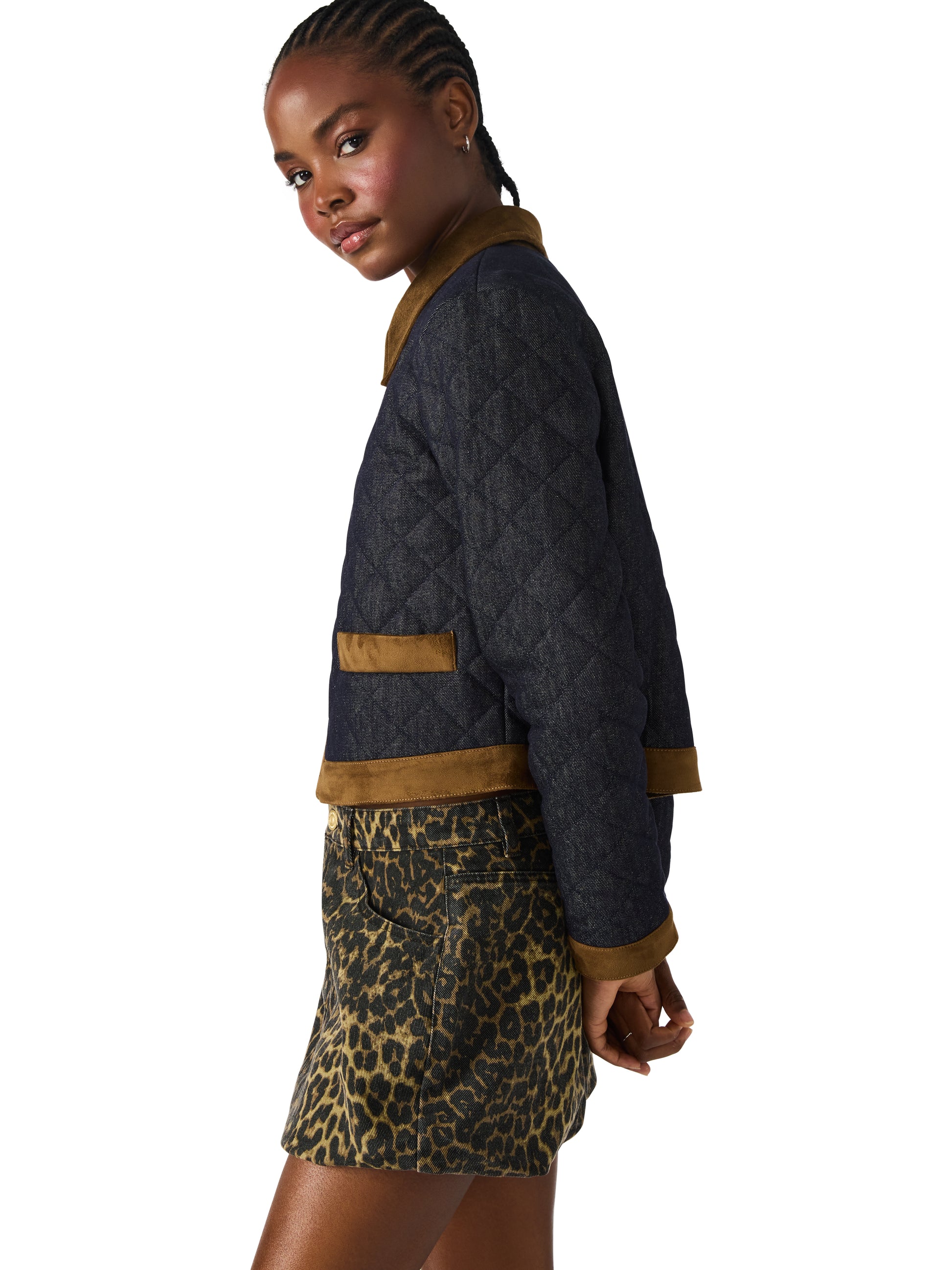 Layer up in style with this quilted indigo jacket that's equal parts cozy and cool. The rich indigo base pairs beautifully with warm brown trim, creating a look that works whether you're heading to brunch or running errands. The quilted construction adds texture and keeps you comfortable through crisp fall days. A versatile piece that transitions seamlessly from casual to put-together—because looking good shouldn't feel like work.