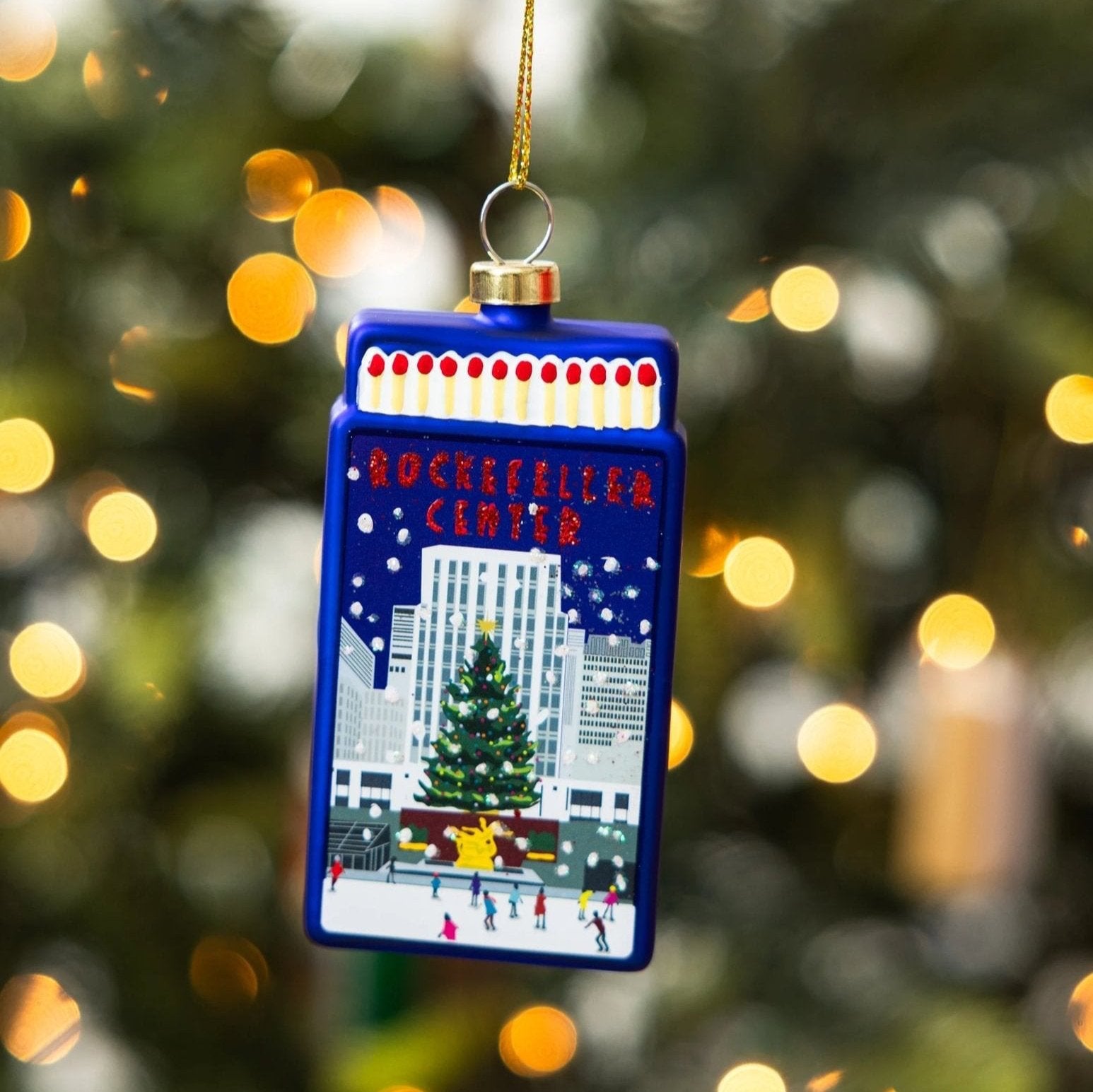 Rockefeller Center Matchbook Ornament with dark blue background.