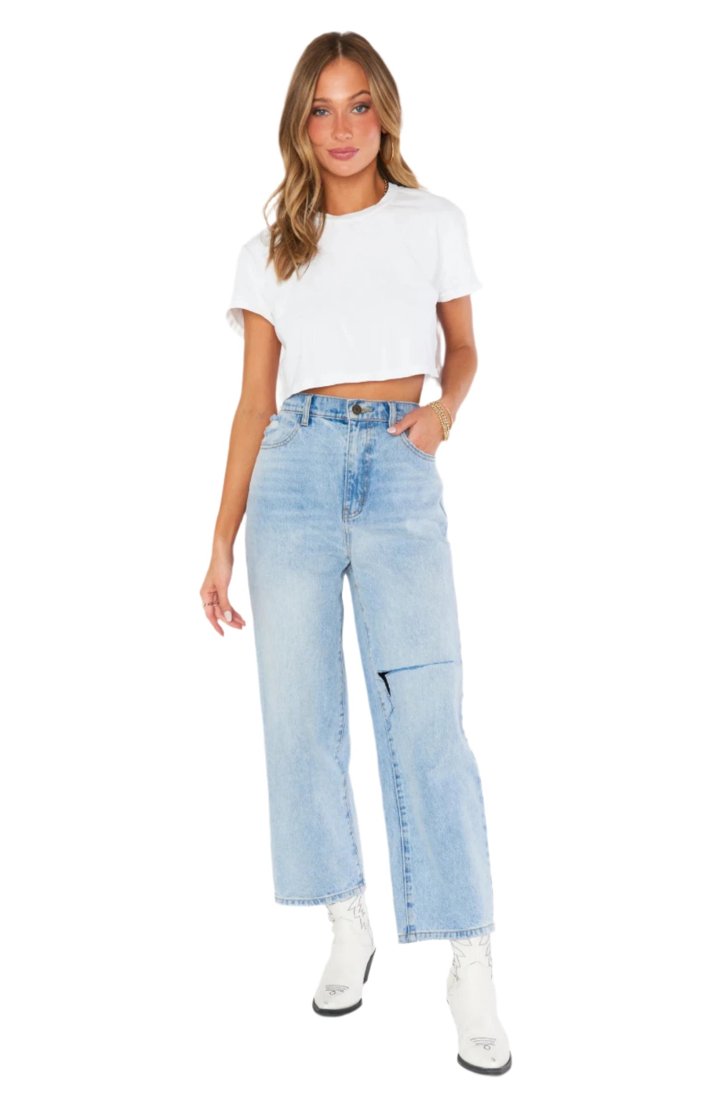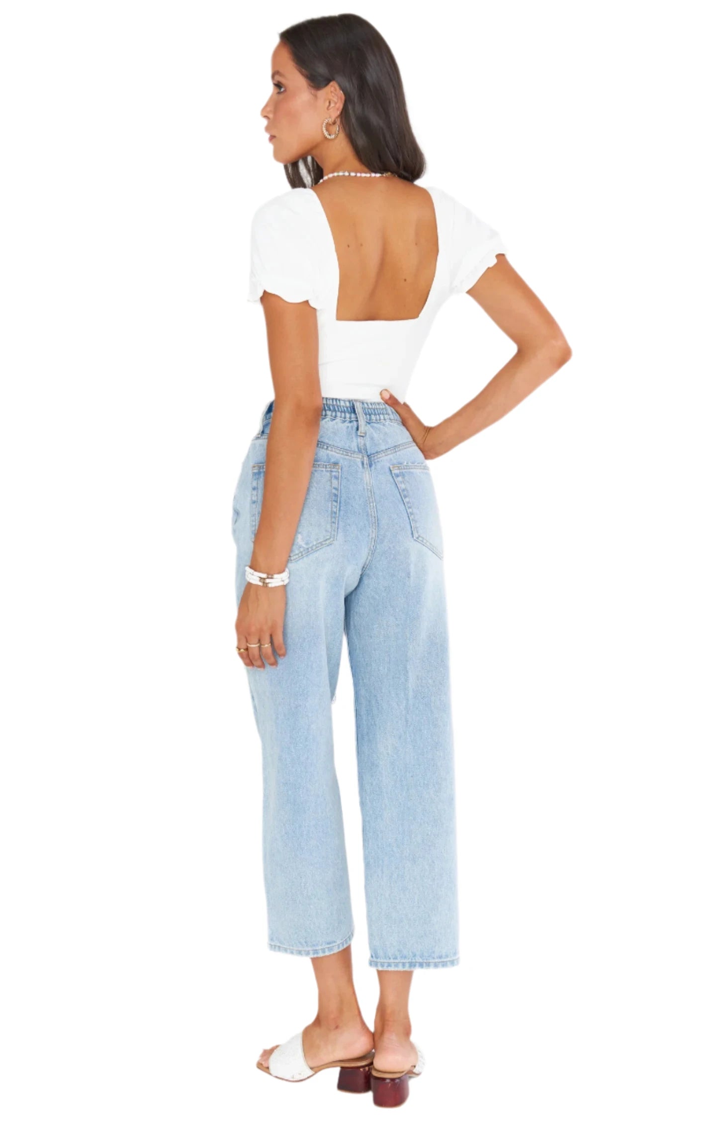 Classic cool girl style in these loose straight leg jeans. We added an elastic waist band to the back to keep your waist snug, while leaving lots of room for that low key loose look. Gap free! For a tighter fit, we suggest sizing down!