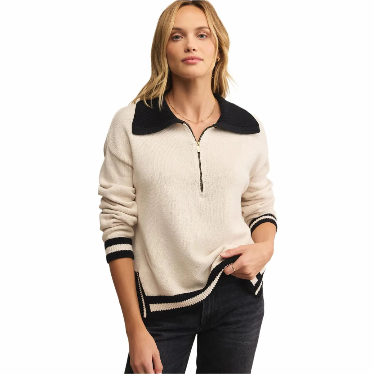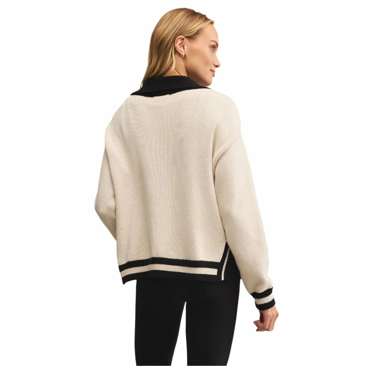 Cream knit sweater with navy collar and striped hem. Half zip front and side slits