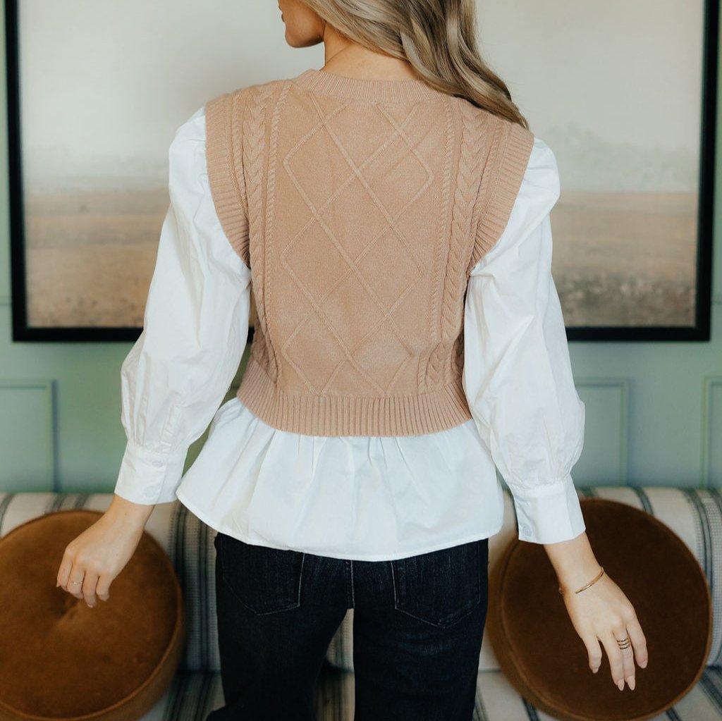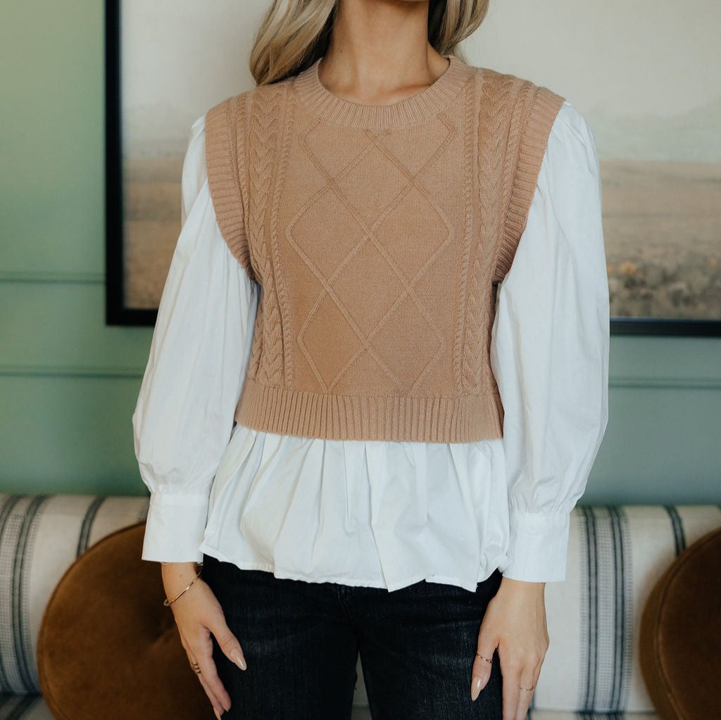 This cute 2-in-1 sweater Top is the perfect combination of cozy comfort and chic style. This sweater vest and top combination offers a modern layered look in one piece, instantly elevating any outfit.