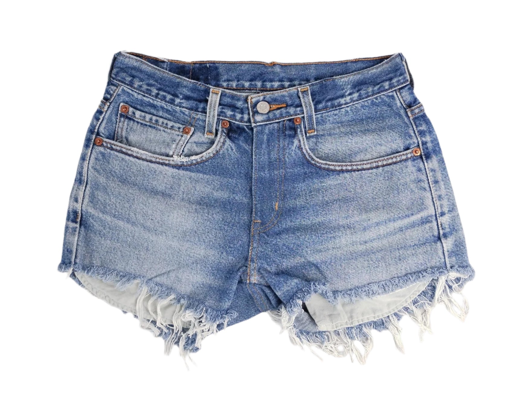 Upcycled Denim Shorts! What is is UPCYCLED? Each pair is re-tailored by hand from a secondhand pair of LEVI's, giving them new life and an updated fit. This style features a mid-rise and raw hem. Denim shades vary, and most original hardware, buttons, and patches are in-tact. Each one is unique! Please keep in mind that this also means the jean shorts are sized true to vintage Levi jeans.