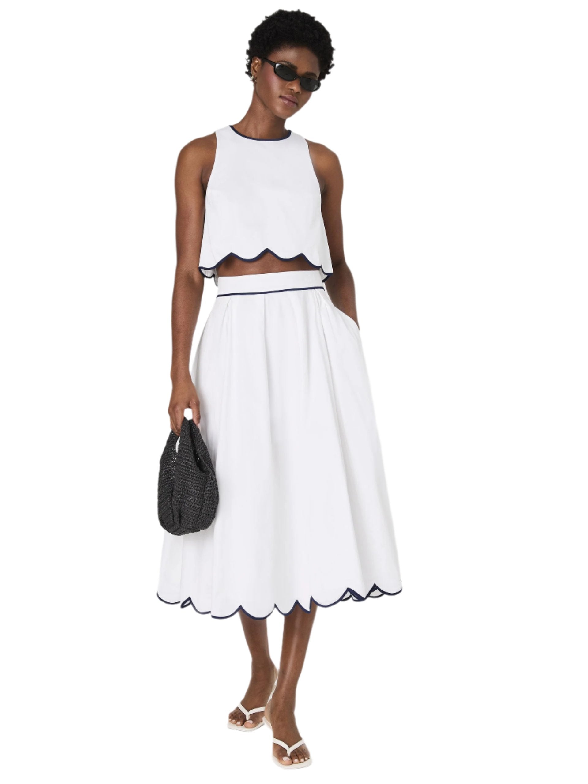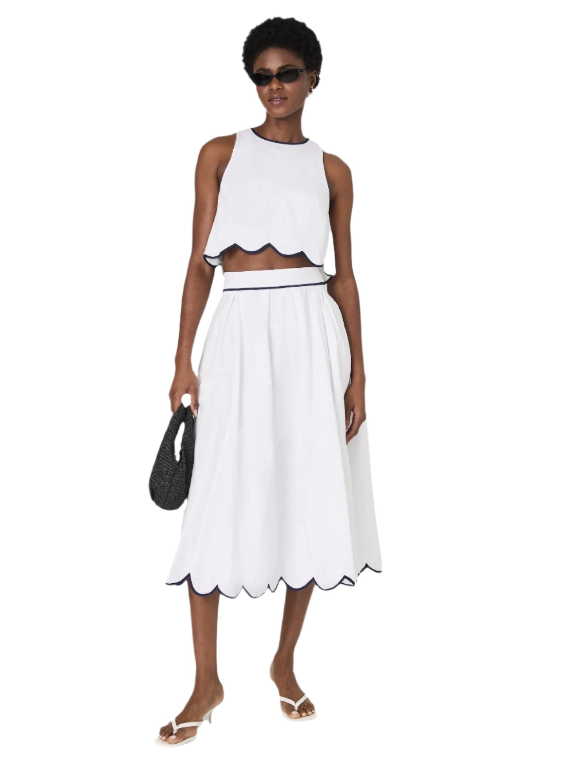 Step into the sun with the White Cotton Scallop Midi Skirt. Featuring a contrasting piped scallop hem and convenient side pockets, this skirt is a warm weather essential. Take on the day in style and confidence with this must-have piece!